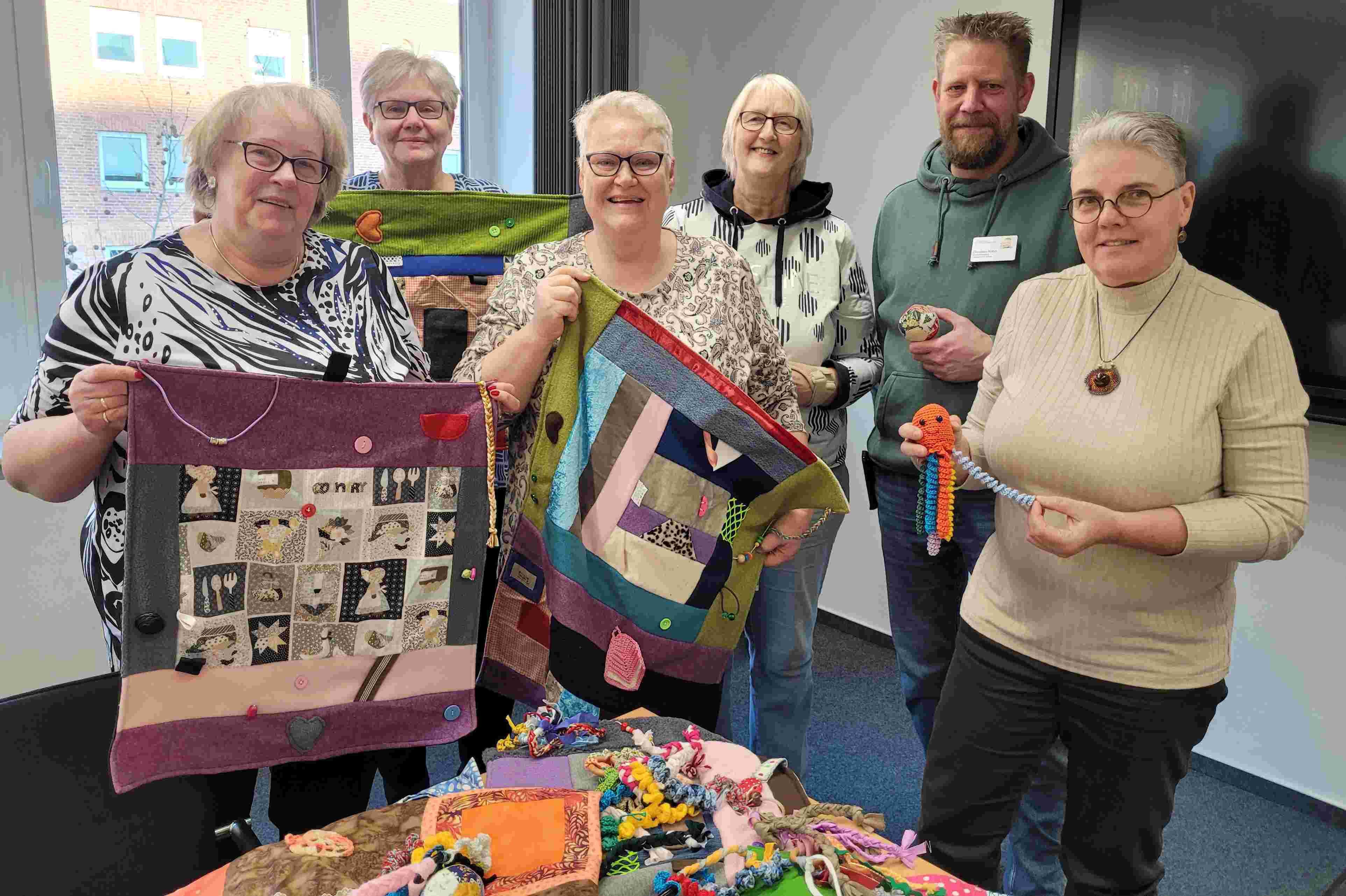 „Wir sind begeistert über diese wunderschönen Nesteldecken für unsere dementiell Erkrankten“, freute sich Pflegedirektorin Sabine Schmidt als Mitglieder des Vereins Herzkissen mit ihrer kreativen Handarbeit kürzlich im Städtischen Krankenhaus vorbeikamen. Demenzerkrankten, deren Hände oft unruhig sind, helfen diese Decken mit Knöpfen Schleifen, Reißverschlüsse, Kordeln u.v.m. entspannter zu werden. „“Wer diese Decken erhält - und sie sind hier sehr begehrt - darf sie auch mit nach Hause nehmen“, erklärt Christian Rahn, Bereichsleiter Pflege Geriatrie.Der Verein mit 80 handarbeitenden Mitgliedern trifft sich einmal im Monat zum Stammtisch, und tauscht Stoffe sowie Equipment aus. Wer sich für eine Mitarbeit interessiert, ist herzlich willkommen; auch qualitativ hochwertige Stoffspenden sind immer erwünscht. Wichtig ist, dass es sich um Bauwollstoffe handelt. Kontakt: herzkissen-kiel.@gmx.deBild:v.li.n.re.: Marlene Petersen, Ute Siebke, Bärbel Gallas und Ingrid Läufer vom Verein Herzkissen sowie Christian Rahn, Bereichsleiter Pflege Geriatrie und Pflegedirektorin Sabine Schmidt vor einer Auswahl ihrer Nesteldecken, Greifringe und Bälle